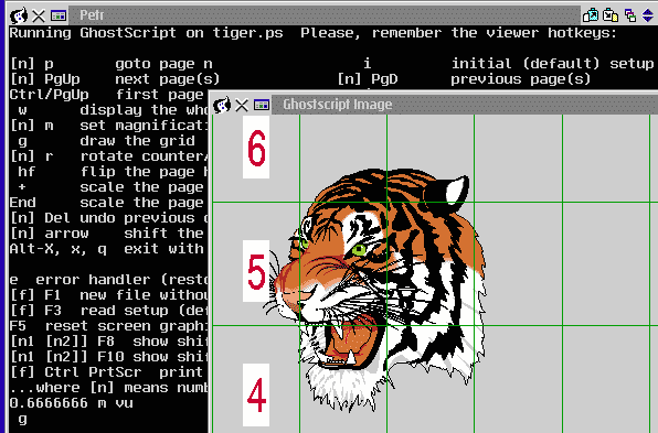 Running GhostScript on tiger.ps Please, remember the viewer hotkeys: [n] p goto page n i initial (default) setup [n] PgUp next page(s) [n] PgD previous page(s) Ctrl/PgUp first page Ctrl/PgD last page w display the whole page c redraw the current page [n] m set magnification factor [n1] [n2] v view magnified and shifted g draw the grid f show the page frame [n] r rotate counter/cw by n*90 deg [n] s set shift for arrows hf flip the page horizontally vf flip the page vertically + scale the page 1.5 times - scale the page 1/1.5 times End scale the page 1.2 times Home scale the page 1/1.2 times [n] Del undo previous change(s) [n] Ins redo undone change(s) [n] arrow shift the page by n (default according to the setting of s) Alt-X, x, q exit with saving the setup Esc quit without saving e error handler (restore virtual memory) [f] F1 new file without browsing [f] F2 new file [f] F3 read setup (def. !ps_rest.ps) [f] F4 write setup F5 reset screen graphics (text cursor) [n1 [n2]] F8 show shifted page [n1 [n2]] F9 show shifted and scaled page [n1 [n2]] F10 show shifted and 1/scaled page (scaling according to m) [f] Ctrl PrtScr print contents of the frame to file [f] (def. printer) ...where [n] means number, [f] means file 1.5 m v u l r d 0.6666666 m vu 1.5 m v q